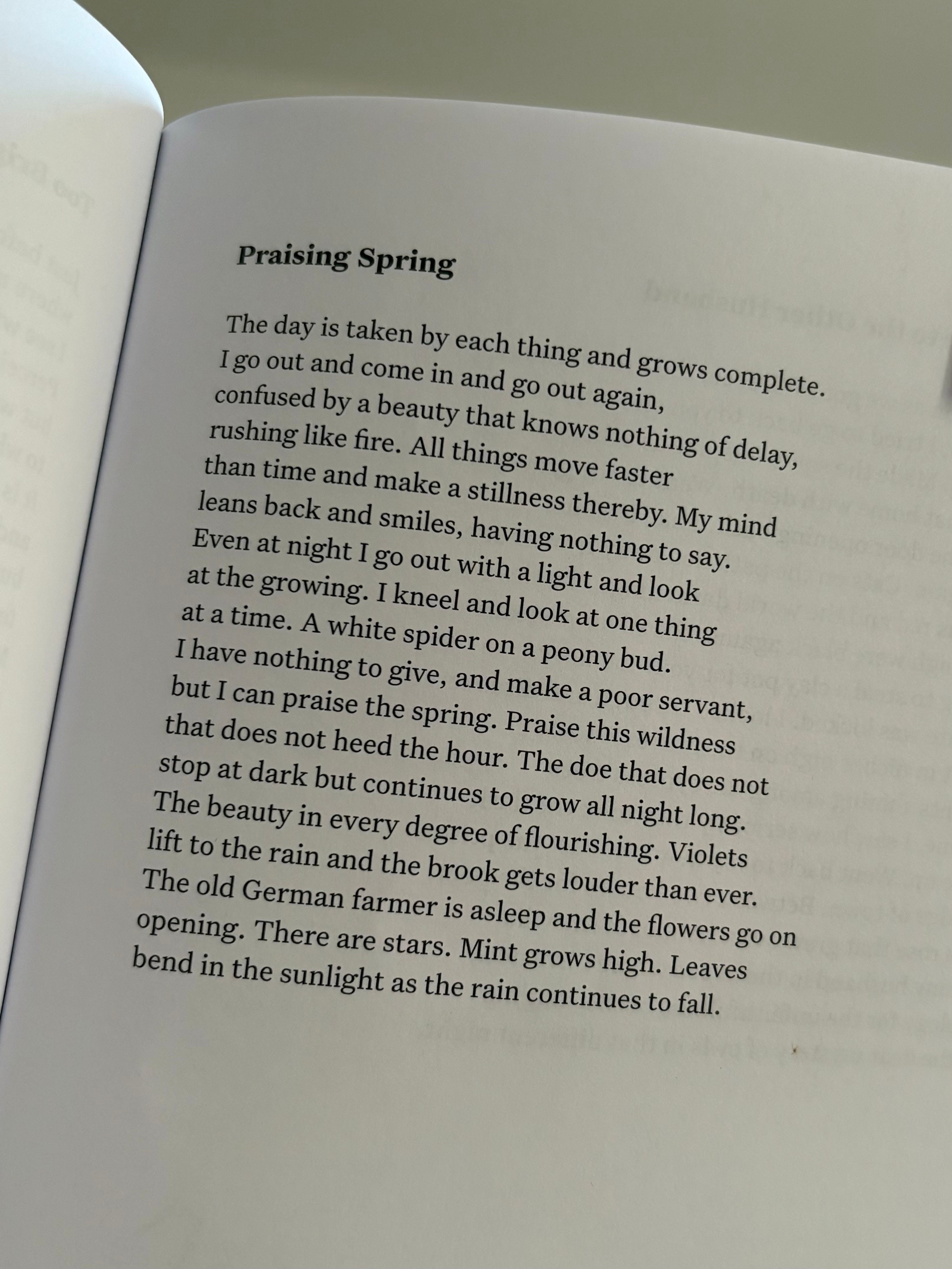 I love love love this poem and was delighted to find it featured in the April edition of Poetry Magazine along with several other poems by Gregg. She is a poet I am always meaning to read more of, and in “Praising Spring,” it seems she is at her very best.
