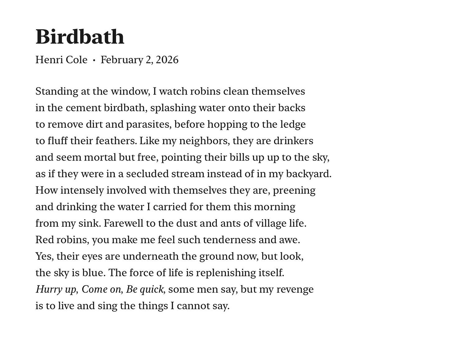 In shorter form, I perused a copy of The Los Angeles Review of Books that someone left in the hallway of my apartment building, and actually flipped through the copies of Poetry Magazine, The New York Review of Books AND The Sewanee Review that showed up on my doorstep. These things are always a mixed bag, but when you come across a real gem it makes the other less gem-like material worth it. I liked “The Gull McCabe” by Robyn Gill out of the Sewanee Review, but it doesn’t appear to be up on their website yet, so I can’t link to it, which is not terribly helpful in this context. If you also subscribe to The Sewanee Review, you can find it on page 47 of the Winter 2026 volume. There was a piece in the NYRB about Gisèle Pelicot’s memoir worth reading, and also one about the writing of Margaret Kennedy which I got bored of in the middle, but served its purpose in making me want to read the recent McNally reissues of one of her books.