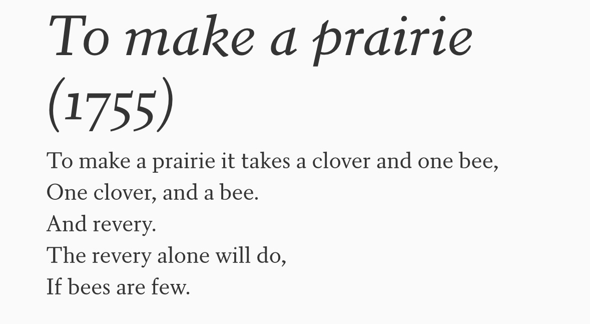 ) I felt lucky to stumble upon this piece on Iris Murdoch’s love-based morality. As a firm believer in the power of attention, I am thoroughly intrigued. Methinks I will start with The Black Prince (Mike, do you approve??).Poetry (For the Maintenance of the Soul):