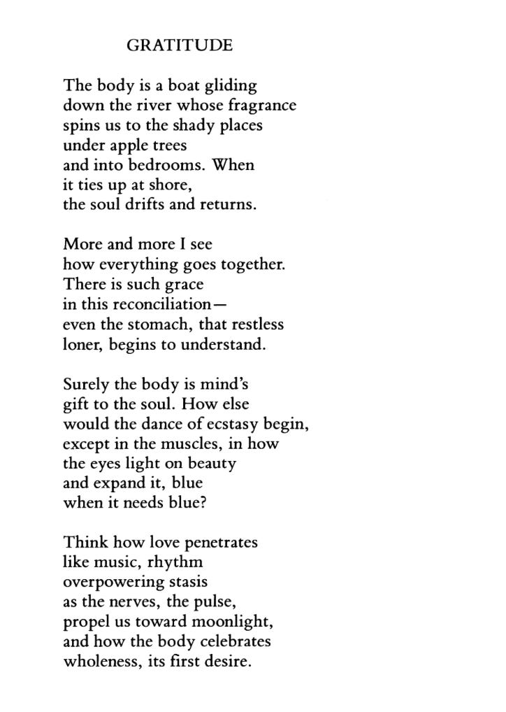 I have a body that will run when I want it to, even if it hurts, and that too is a source of great astonishment. I am grateful that my body will and can do this for me. I recently have been running in the dark and the way that the Hudson River looks in the dark, like dirty paintbrush water, and the way that it moves, like terror, makes me feel like something deep and primal is trying to communicate with me through the dark undulation.