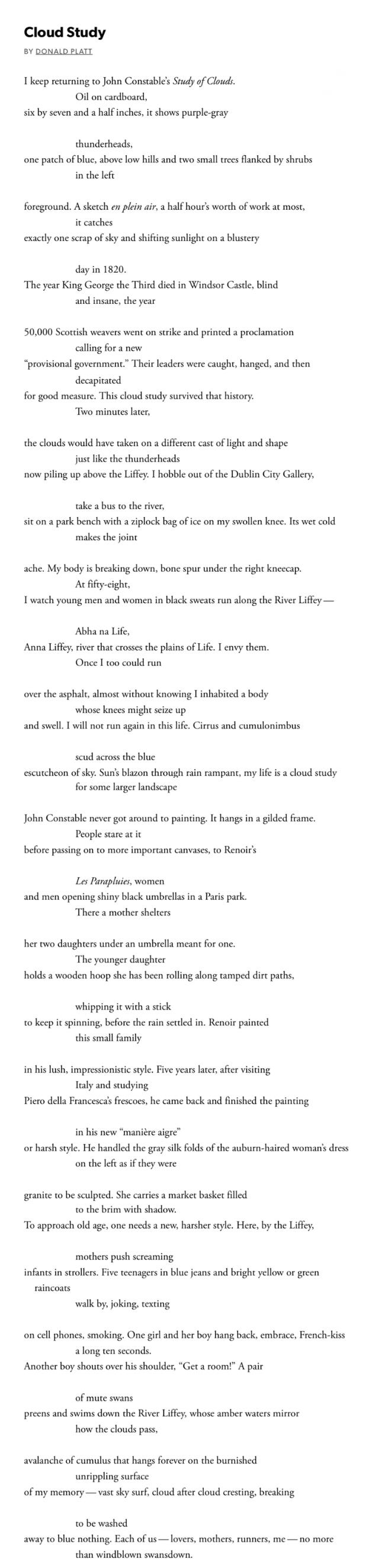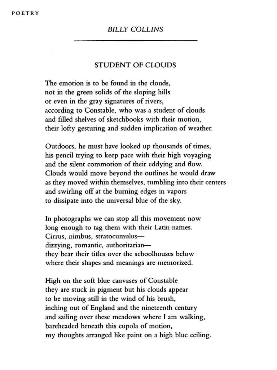 There are so many things that may make Constable’s work with the clouds compelling to poets. There’s the art itself—in which the clouds really do say something. A poem about a piece of art is an ekphrastic poem, but beyond the visual inspiration, there is something about Constable’s work that captures the imagination.2 It’s the clouds themselves, symbolically rich, containing beauty and terror, relief and torment, life and death. The transitory, ephemeral quality that they have, which of course, reminds us of our own impermanence. What poet can resist impermanence?