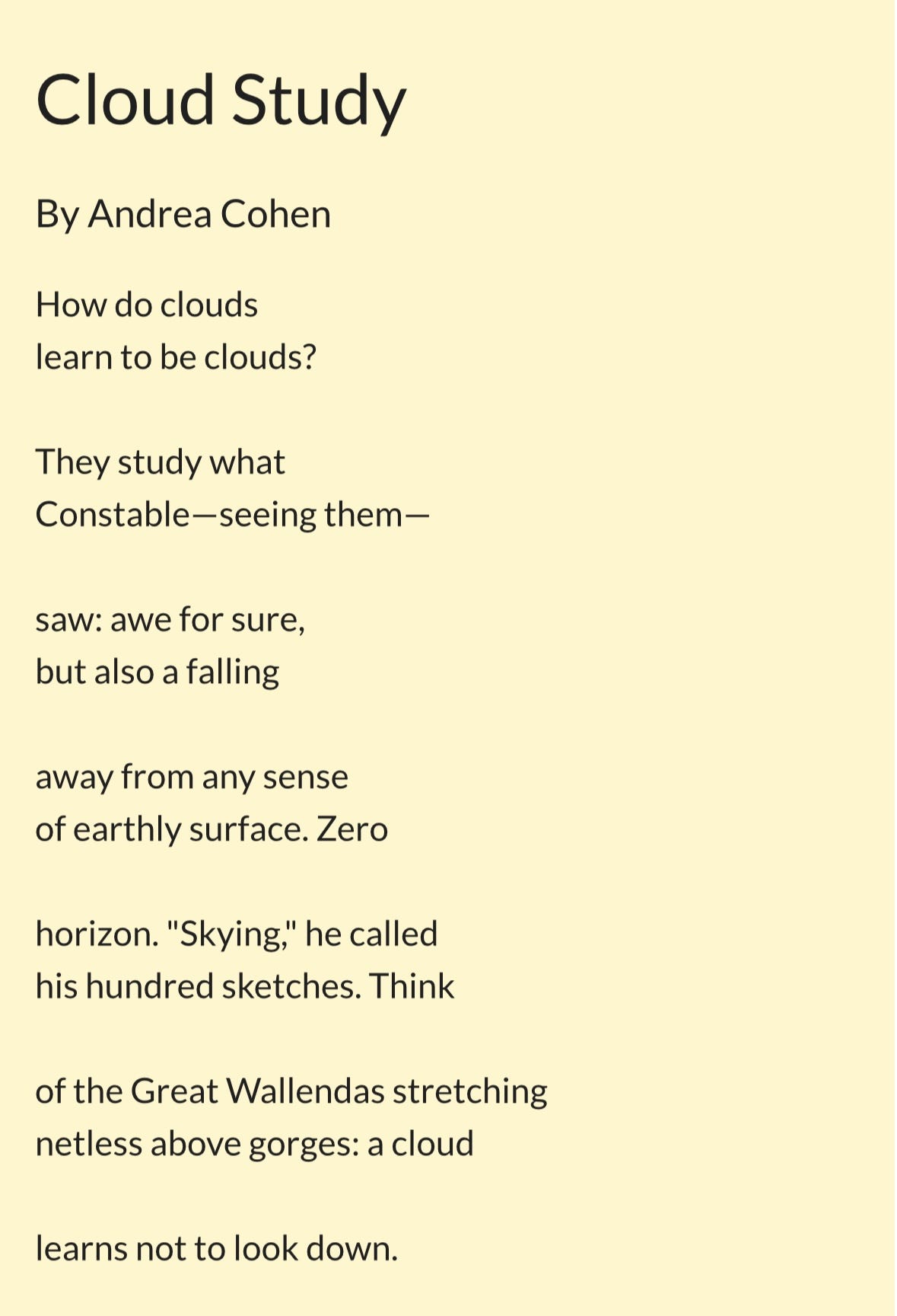 Last week, a favorite weekly poetry email1 landed the lovely “Cloud Study” by Andrea Cohen in my inbox.