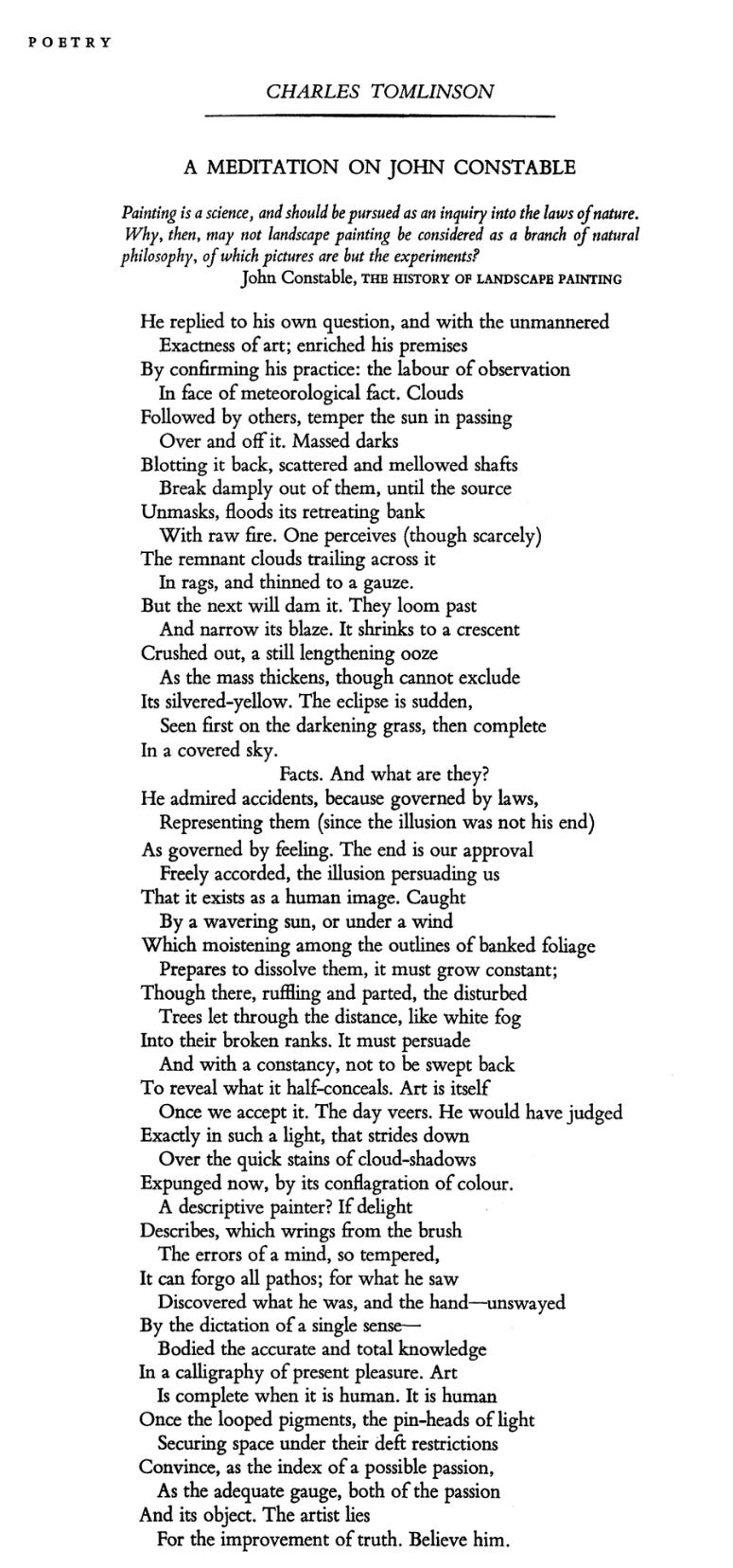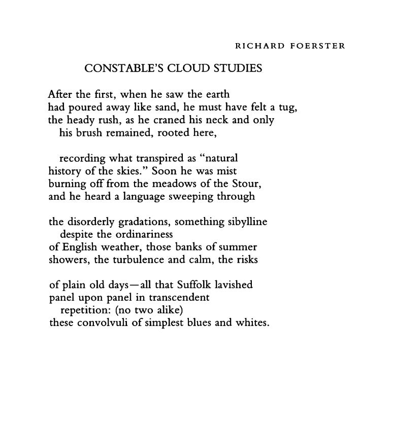 I was struck by the quite obvious realization that different people write poems about the same things all the time over and over again. This undeniable fact is of limited interest—par for the course—when the chosen subject is broad and general: love, birds, death. It is of greater interest when that thing is as specific as John Constable, for the thing seems specific, but the proliferation of poems seems to prove that it is not.