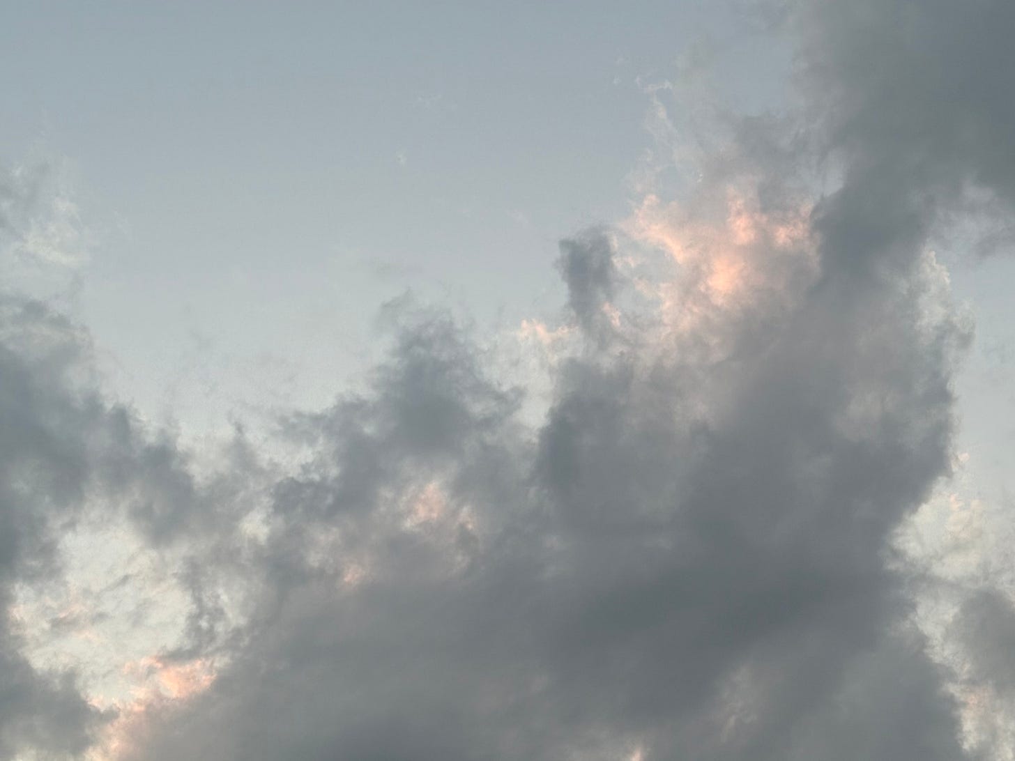 The clouds turn brown in the last grip of sunset, or at least they have tonight. If you watch the sunset every night, every night will produce a color you’ve never in your damn life seen before. The sky behind me is a bruised peach, but above me it is still very blue. Passing clouds wisp out, and at the edges an electric light glows as if each one has some secret smaller sun behind it. Our big sun has dipped below the horizon already, so where is the light coming from?